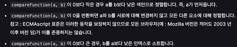 - 즉 sort() 함수에서 두 값을 비교 시 리턴값에 따라