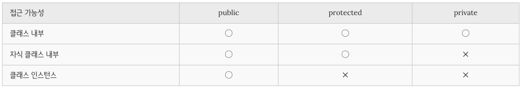 - 접근 제한자의 사용 범위는 아래와 같습니다.