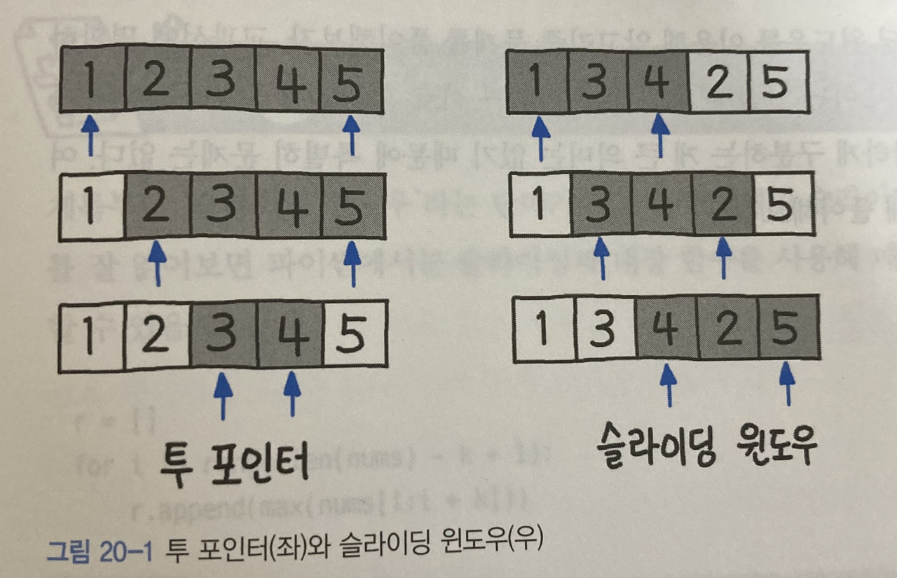 위 이미지를 참고하여 보면, 투 포인트 알고리즘은 구간의 넓이가 조건에 따라 유동적으로 변하며, 슬라이딩 윈도우 알고리즘은 항상 구간의 넓이가 고정되어 있다는 차이점이 있습니다.