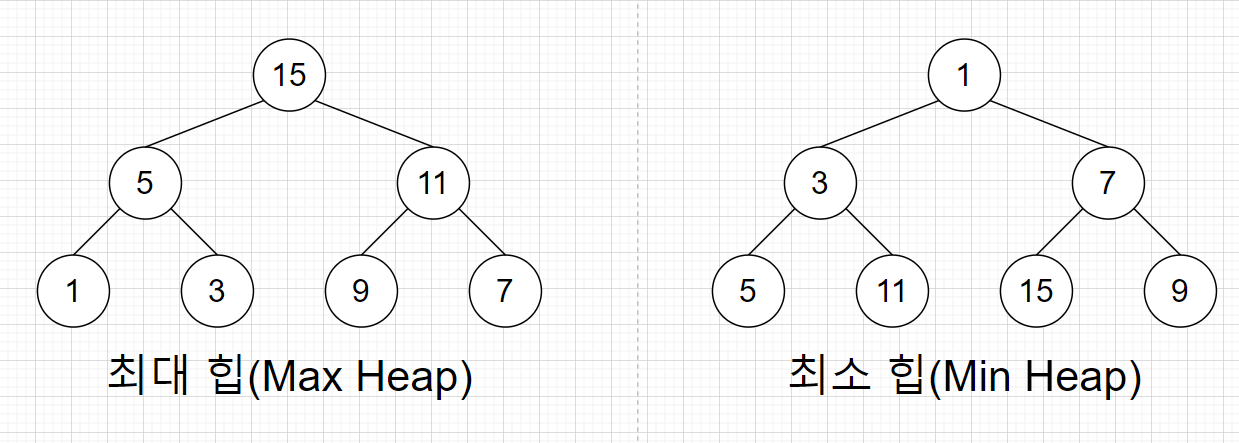- Heap은 완전 이진 트리이며,( 마지막 레벨을 제외한 모든 레벨의 노드가 완전히 채워져 있으며, 마지막 레벨의 노드는 왼쪽부터 채워져있는 트리 구조) 루트 노드가 최대값을 가지는 최대 힙, 최솟값을 가지는 최소 힙이 있습니다.