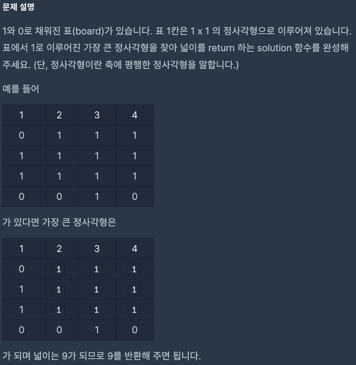 가장 큰 정사각형 찾기 문제 설명 1과 0으로 채워진 표(board)가 있습니다. 표 1칸은 1 x 1의 정사각형으로 이루어져 있습니다. 표에서 1로 이루어진 가장 큰 정사각형을 찾아 넓이를 return하는 solution