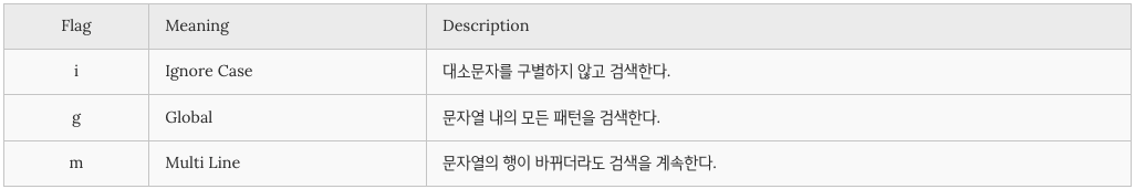 따라서 플래그를 사용하지 않은 경우 문자열 내 검색 매칭 대상이 1개 이상이더라도 첫 번째 매칭 한 대상만 검색하고 종료합니다.
