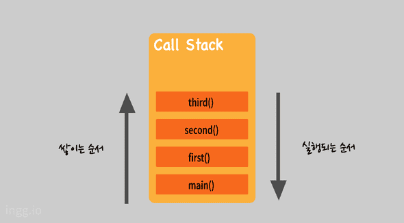 - 함수의 실행이 완료되면 콜 스택에서 지워집니다. third, second, first, main 순으로 pop되기 때문에 "세번째, 두번째, 첫번째" 순으로 콘솔에 찍히며 최종적으로 호출 스택이 지워이 비워집니다.