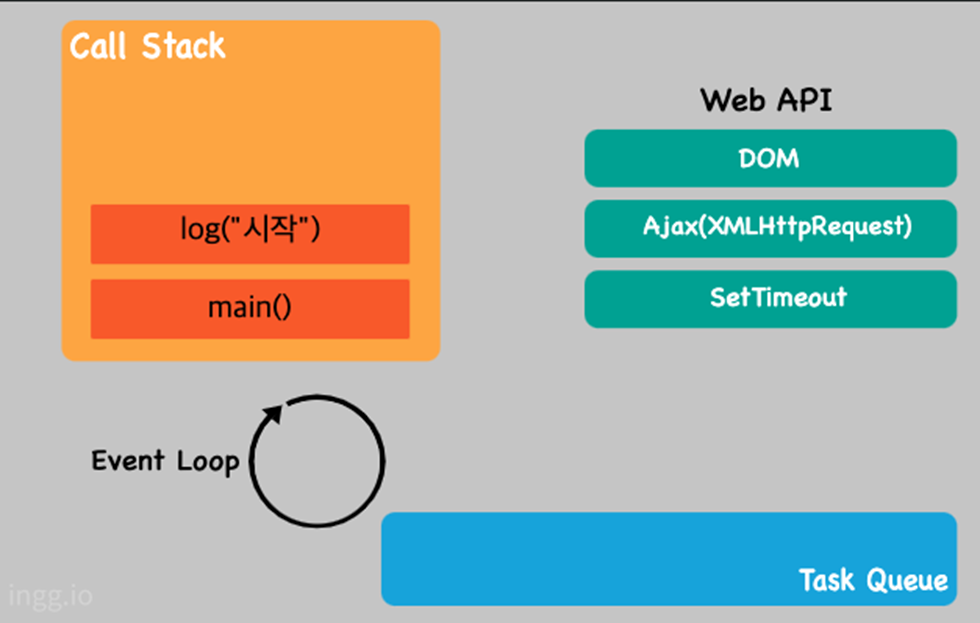 - 1. 먼저 전역 컨텍스트 main() 함수가 콜 스택에 쌓이고 그 다음으로 console.log('시작')이 콜 스택에 쌓입니다.